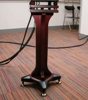 高級スピーカースタンド“Dinosaur”は今月末から来月初旬の発売を予定。価格はペア30万円を予定している。色は写真のウッド色とブラックを用意。恐竜の足を模したデザインと重厚な造りが来場者の注目を浴びていた。
