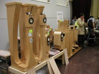 2回エントランスすぐ横の大会議室は例年即売場になっているが、その一角にブースを構えた山越木工房の製品群には目を奪われた。曲げ合板を使ったキャビネットかと思ったら、フィンランドバーチの薄い単板を使って1枚ずつ曲げ、重ねていくという手の込んだ工法だという。私もスピーカーは自分で作るが、このような工作は300年かかっても自分にできるようになるとは思えない。自作スピーカーの仕上げに悩まれている人、ご家族から苦情の出ている人は、思い切ってこういう工房に自分の設計を託してみるのもよいのではないか。