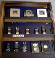 フルテックのブースには、CESにも出展された(関連ニュース)カーボンと削りだしステンレスを使用したACコネクターの試作品が参考出品されていた。こちらは5月に発売を予定しているとのこと。セラミックパウダーとカーボン、ステンレスという制振作用の高い部材を使用することで、電流が流れる際に発生する振動を吸収することができるという。