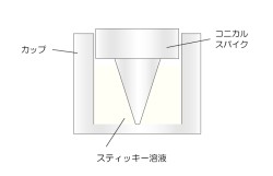 「C-PROP」の最大のポイントは、樹脂素材を使い、透き通った質感のスパイクとカップの一体化構造。さらに今回、特許出願を果たした“振動抑制溶液”がカップ内に封入されている。ここには、電磁エネルギーの吸収、電磁界による振動発生の抑制、さらには振動エネルギーの吸収効果を高めるといった効果が実証された、新しい振動抑制技術を採用しているという。