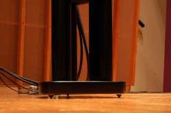さてこの写真でTAD-CR1は、本機専用スタンド「TAD-ST1」に乗せられているが、スピーカーの底面付近を良く見て欲しい。一見スピーカースタンド天板のように見えるグレーの部分は、上で述べたアルミ板。その下の、3本の柱に囲われたような黒い部分がスタンドの天板だ。天板はCR1の底面よりもサイズが小さめに作られており、スタンドの柱部分で振動を吸収するようなかたちになっているとのことだ。