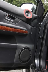 Esotar2は、トゥイーターの110をフロントガラス脇のAピラーに、ミッドレンジの430をドア上方のAピラー付近に埋め込んだ。この際、ウーファー側からの背圧の干渉を避けるため、制振材を巧みに使ってエンクロージャーを製作することなく、ドア内部のセパレート化を行っている。ウーファーはドア下方の純正位置にアウターバッフルを製作して設置した。