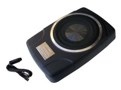 スピーカーレベル入力(ハイレベルインプット)用ケーブルや電源配線用パワーケーブル等すべて付属。最大出力160Wで、薄型小型ながら本格的な低音再生を実現している。