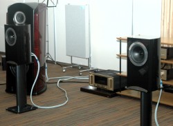 KRIPTON「KX-3P」(製品データベース)は密閉型スピーカー。「特に低音に注目してほしい」と男性ボーカル曲を中心に再生していた。