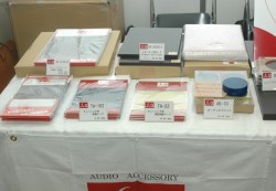 オーディオアクセサリーシリーズ「fo.Q」を展開する木曽興業は、チューニングシートからオーディオブロック、レコードスタピライザー、オーディオラック、スピーカー用ボードなど幅広いアクセサリー製品を展示している。