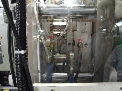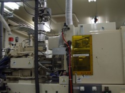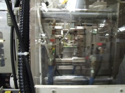そしてポリカーボネート樹脂を1.2ミリ厚の透明ディスクに成型する際に、スタンパーからの情報を転写される。顆粒状のポリカーボネートが熱で溶かされ、30トンもの圧力で射出成型される瞬間が、プレス工程のなかでも一番迫力のあるところだ。