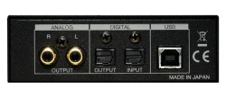 光デジタル音声、アナログ音声の出力端子を1系統ずつ搭載。ヘッドホン出力は1系統。USB端子(最大96kHz/24bit入力に対応)も1系統備えている。フロントパネルには、ヘッドホンとアナログ(RCA)のアウトプットセレクターも備えている。電源はUSBバスパワーで給電。PLL専用電源を搭載しているため、安定した動作が可能だ。