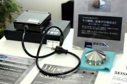 また同社が取り扱うAiTECの電源フレッシャー「Λ5.35」のデモも行っており注目を集めている。「Λ5.35」は壁のコンセントに接続するだけで、波長の活性化で波形、力率を改善し、オーディオ機器に質の良い電源を供給できるというオーディオアクセサリー。58,000円(税込)で販売している。昨年末にオーディオアクセサリー誌135号で評論家の林正儀氏が紹介したことから話題となり「以来コンスタントに月100台以上売れている」(同社)という大ヒット製品。その詳しい構造は明かせないとことだが、機器の音色を変えずに性能を向上させることができ、テレビや冷蔵庫のノイズを抑えることもできるという。