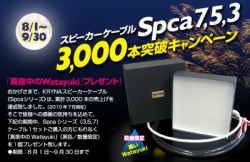 KRYNA&PLUTON(株)は、KRYNAブランドのスピーカーケーブル「Spcaシリーズ」のSpca 3/Spca 5/Spca 7ケーブル1セット購入者にもれなく吸音材「Watayuki」限定カラーモデルを1個プレゼントするキャンペーンを行っている。期間は8月1日から9月30日まで。