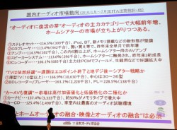 校條会長は、「オーディオ業界はなかなか厳しく、安閑とはしていられないが、個々を見ていくと、今年前半の6ヶ月でアンプやCDプレーヤーが2桁の伸びを示しているなど、マイナスの分野ばかりだけではない」と指摘。