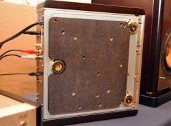 ボトムシャーシにはアークベースを設置した。底面にはウッドボードを装着し、振動吸収と筐体の剛性を向上させている。解像度、および空気感の向上にもつなげ、音の安定や低重心化も図られている。それぞれのパーツを結合するためのネジとワッシャについても、銅と銅、銅と真鍮と、それぞれに音の作り込みに気を配りながら用いている。両コンポーネントともに真鍮無垢のインシュレーターを3点支持で配置し、振動による影響を最小限に抑える構造としている。さらに付属のスピーカーケーブルについては、A150は18番線を用いていたが、本機では14番線の大型サイズのケーブルを使っている。スピーカーターミナルは金メッキ処理を施してある。