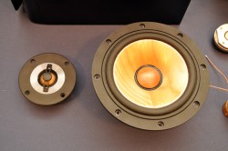 トゥイーター部は2cmウッドドーム振動板、50φネオジウムメインマグネットの採用などを特徴とした。マグネットはフェライトから、今回ネオジウムに変更してウーファーの音圧に見合う高域再生を実現する。振動板の前面に配置したディフューザーを支えるアームのデザインも変更された。端子のメッキはスズから金に素材を変更し、ピュアな高域再生を実現。トッププレートは銅箔処理を施し、より歪み感を少なくしている。
