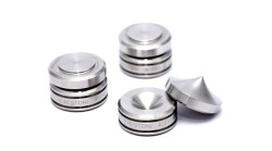 「FR-C001」の寸法は外径25mmφ×高さ20mm。3点スパイク支持方式で、コーン形状の上部ピースと、すり鉢状の下部ピースの2ピース構造となっている。上下の接触部分を点接触とすることで、スピーカーの場合は置台からの振動やスピーカーボックス底面からの振動を遮断。またアンプなどでもオーディオラックなどの振動を遮断することが可能だ。材質には木材やアルミ、チタンなどよりも比重の高いステンレスを採用することで、重量の軽い小型スピーカーやアンプ類にも十分な効果を発揮するよう設計されている。