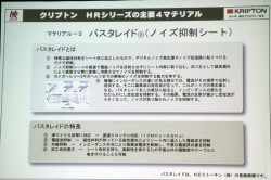 三つ目は「バスタレイド」。これはNECトーキン(株)が開発したノイズ抑制シート。特殊な磁性材料をシート状に加工したもので、表面で電磁ノイズを反射させずにシート内部に取り込み、磁気を熱に変換し消費させることでノイズを抑制するという。10MHz〜6GHzまでの帯域のノイズを抑制する能力を持つとのこと。シート状のため、加工の自由度が高いのも特徴のひとつだ。