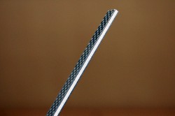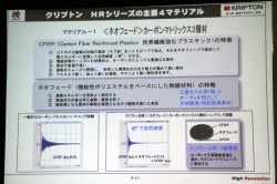 ひとつめの素材は「<ネオフェード>カーボンマトリックス3層材」。機能性ポリエステルをベースにした制振材料「ネオフェード」を、CFRP(炭素繊維強化プラスチック)で挟んだもので、上下のカーボンで不要振動音速を速め、表面波(横波)として高速に伝播させ、そのエネルギーをネオフェードが熱に変換し吸収。振動を収めるのだという。ネオフェードは、三菱ガス化学(株)とオーディオ用として共同開発したもの(特許取得素材)だ。