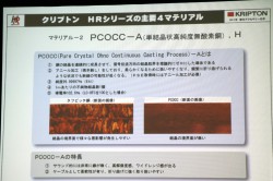 ふたつめの素材は「PCOCC-A」。銅の結晶を連続的に成長させて信号伝送方向の結晶粒界を理論的にゼロにした導体。純度99.99997%の銅で、伝導率が高く、アニール加工を施しているため柔らかく扱いやすいとのこと。