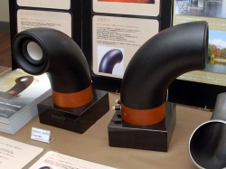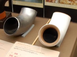 同社では、ユニークな形状で注目を集めるスピーカー「R-1」を今回も用意。制震処理を施す前と処理後のボディ材も用意し、それを実際に木の棒で叩いて制震・静音処理の効果を体験できるようにもしている。