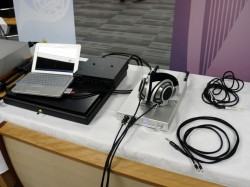 また、関口機械販売のアコースティックリバイブ製品の紹介スペースも展開。ノートPC内の音源を使い、ヘッドホンのリケーブルによる効果を体験できるようにもなっている。また、本日発表された北陽木工のルームチューニング材“AMBIENTEX”(関連ニュース)もブースの一角に設置されていた。