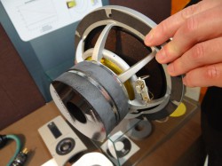 ウーファーのドライバー部分には、欧州のパートナー企業と共同開発したという新しいマテリアルの「SMC(Soft Magnetic Compound)」を採用。砂鉄をベースに、粒子の一粒ずつに化学的なコーティングを施して音響特性を高め、これに圧力をかけて固体化したものが用いられている。従来は鉄を用いていたポールピースやトッププレートなど、ドライバーを形成する各パーツにこの「SMC」を用いることで、磁気回路に発生する渦電流を約1/1000程度に軽減することができ、音質に大きなメリットをもたらすという。またインピーダンス特性も安定化することができ、インダクタンス成分も低周波から高周波までフラットにコントロールができ、電気的によい効果が得られる。