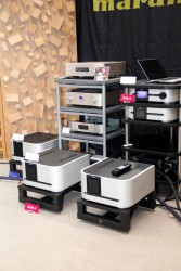 マランツ製品では「NA7004」をアピール。ブラックモデルがクリアケースに収められ展示されていた。またオーディオクエストの新製品も出展。先日インタビュー記事でお伝えしたとおり、USBケーブルにA-Dockコネクタタイプが登場したが、これらを含むオーディオクエストの豊富なラインナップを確認することができた。