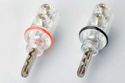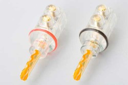 両製品とも赤黒4個ずつの8個セットで、接続可能最大ケーブル被膜外径は8mm。「6202-RO」はロジウムメッキ仕様、「6202-G」は24K金メッキ仕様を採用している。