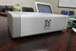 まずは「Q KORE6」と呼ばれている箱状の物体を持ち出してきたベングトソン氏。フロント部はモデル名が記されているのみで、リア部にはスピーカー端子形状のものが6系統搭載されている。電源らしきものは見当たらないので、パッシブ式のアイテムであることはわかる。