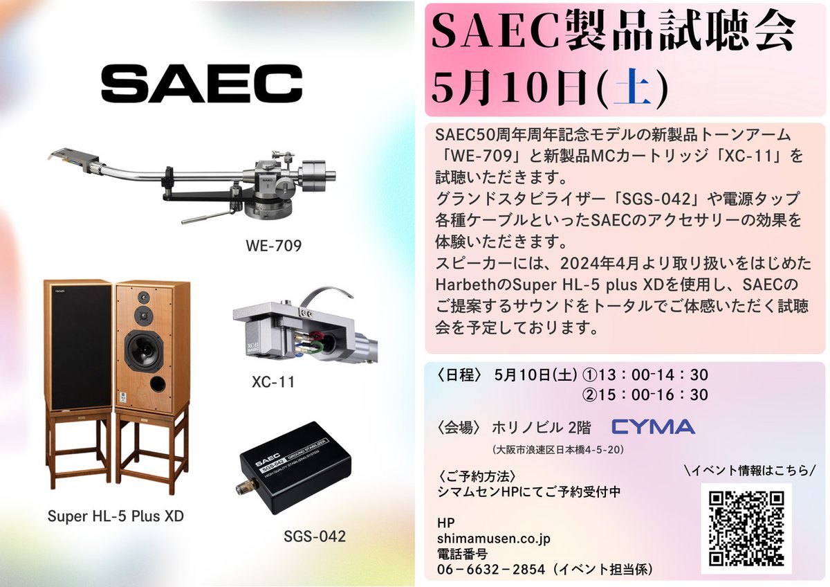 大阪・日本橋のオーディオショップ シマムセンは、5月10日(土)にサエクのアナログ製品を中心とした試聴会を開催する。メーカー担当者が講師を担当し、場所はシマムセン別館2FのCYMAにて。