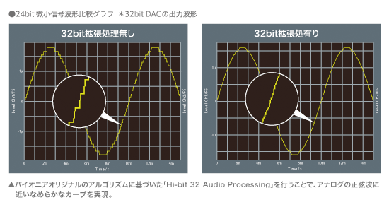 「Hi-bit 32」技術により、16bitや24bit音源を32bitまで拡張して処理でき、アナログ波形に近い音を実現する