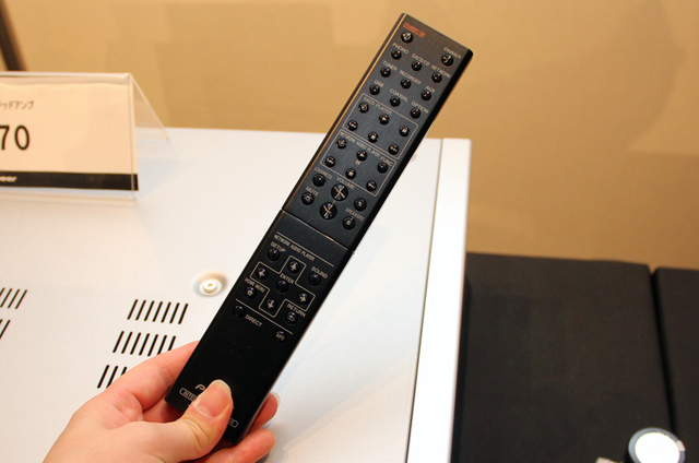 A-70のリモコン。ヘアライン仕上げのアルミ素材を使用している