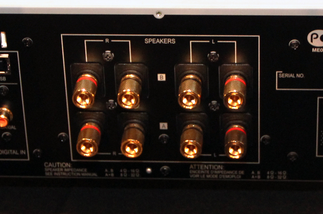 スピーカー端子は真鍮削りだし加工のカスタム金メッキ仕上げ