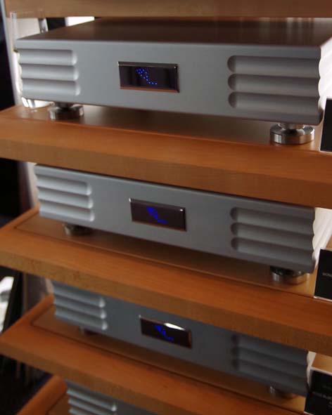 2014年発売予定のMONO BLOCK PHONO AMPLIFIER(\6,615,000)は、MC専用のフォノイコライザー。左右チャンネル用と電源部の3筐体構成となる