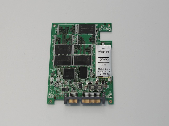 SSDの基板。急に電源が切られた際にも、右側のキャパシタから電源を供給して、書きかけのデータを保持することができる