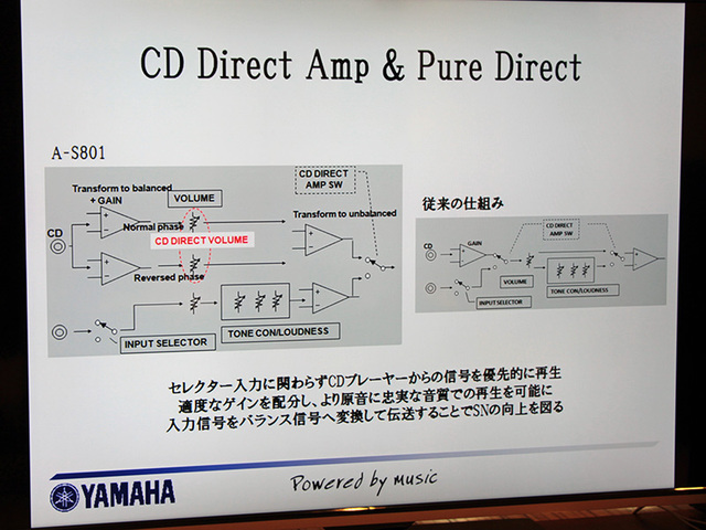 CD入力信号をバランス信号に変換して内部伝送し、出力時に再度アンバランス信号に変換する仕組みに進化した「CDダイレクト&ピュアダイレクトモード」