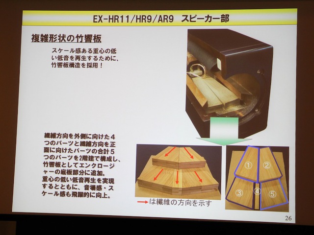 スピーカー内部底面に複雑形状の竹響板を設置