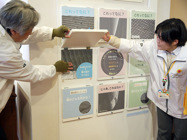 レコード盤の溝を電子顕微鏡やマイクロスコープで拡大し、音の記録と再生のしくみを説明する貴重な展示は同文化館職員の手づくり