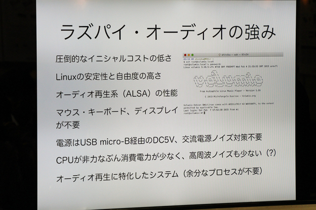 ラズパイ・オーディオの強みはもちろん、課題や難しさも説明された