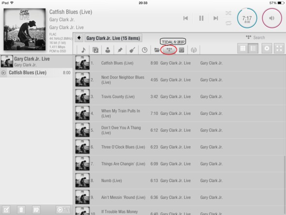 「LUMIN App」でTIDALの楽曲を選曲したところ