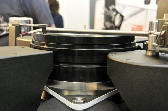 プラッターを横から見たところ。ステンレスやタングステン、デルリンなどをハイブリッドしたプラッターは、特殊マットによるベルトで駆動される仕組みとなっている
