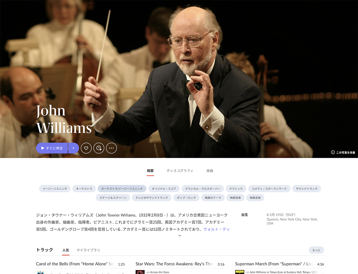 ジョン・ウィリアムズのバイオグラフィーや、関わった作品一覧などもタップで簡単に表示できる