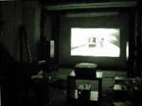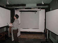 | 左:スクリーンの膜面を調べる林氏 右:プロジェクターの画質を調べる村瀬氏 |