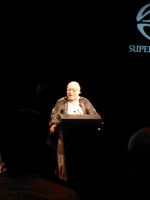 | <左>SACDのメリットを賞賛するタワーレコード創設者のラッセル・ソロモン氏 <右>発売済みタイトルと各社のハードウェアを一堂に会したSACDパビリオン |