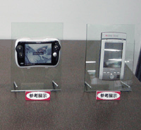 東芝の提案した形(写真はモックアップ)は数種類あり、ケータイ電話型や、ポータブルMDプレーヤー型、現行製品のポケットPC“Genio e"型のモバイルTV端末などもあった。