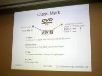「クラスマーク」の細かな運用ルールについては、DVDフォーラムフラグチェアを務めるパイオニア(株)の松田氏から説明された。DVD-RWのクラスマークについては現在、DVDフォーラムにおいてそのロゴが取り決められ、ロゴマニュアルが設定されている段階であるという。コンシューマーの困惑、誤解をさけるためにも、DVD-RWを「必ず1倍速に対応するものをクラス0」「必ず4倍速に対応するものをクラス1」に区分し、「クラス1」に該当する製品には、ディスク盤面やパッケージにマークが表記されるようになる。さらにパッケージにはクラスマークの説明文を明記することとなる。クラスマークについては、今後ロゴマニュアルが正式にリリースされるとともに、RWPPIのホームページでもその詳細が報告される予定である。