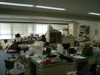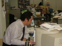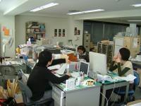 | 左/「村田さん、ご安心ください。校了しましたよ」印刷屋さんに校了の連絡をする大橋編集長。 右/「みんな買ってちょ」という言葉が飛び交う編集部 |