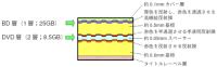 本ディスクは、表面部分に容量25GBのブルーレイ単層、内部に容量8.5GBのDVD2層を設け、合計33.5GBの大容量を実現した片面読み取り3層構造となる。