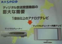「地上デジタル放送対応のテレビ出荷は着実に伸び、約580万台に達したが、まだまだ市場にはアナログ放送用のテレビ、ビデオが多く残っている。その数は1億台以上にのぼる。2011年7月24日に終了が決定している、現行の地上アナログ放送だが、アナログ放送用テレビでは、1)地上デジタルチューナー内蔵モデルに買い換えるか、2)外付けチューナーを接続して対応するか、の2点を選ばなければならない」と説明された。