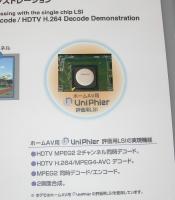 本日の発表会会場では、携帯電話、ホームAV&カーAV、パーソナルAVそれぞれのUniPhierに関するデモ展示も行われた。ホームAV用のUniPhierでは、HDTV H.264HDデコードのデモと、HDTV MPEG2 2chデコードのデモが行われた。また携帯電話用のUniPhierはワンセグ放送の受信デモを実機を使って行った。展示解説員によれば、これらの技術が将来「技術の横展開」を実現すれば、例えば「UniPhierの統合プラットフォームを活用することによって、ワンセグ放送をSDムービーカメラで受信するといった楽しみ方も実現可能」であるという。
