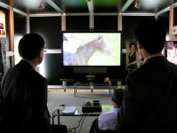 大日本印刷のブースには同社が新しく開発したスクリーンが展示され注目を集めている。ブース正面には独自開発の素材を用いて明るい部屋でも高精細な大画面映像を実現する外光吸収スクリーンのハードボードタイプを展示する。またインタラクティブ機能を実装した透明タイプのスクリーンも展示されている。