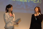 また総会の後半では、TBSの竹内香苗アナウンサーと、同局でワンセグ編集長を務める清水氏が登壇。TBSが現在検討しているワンセグのデータ放送サービス案が紹介された。災害情報の配信、番組内で紹介したプレゼントへの応募、クイズへの参加のほか、レシピ情報などの携帯電話への保存、着メロや着うたのダウンロード、番組へのメッセージ送信などの具体的なサービス例が明らかにされた。