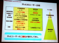 さらに、同社が行ったユーザー分析についても説明。テレビのユーザーについては、「価格を重視するユーザーと付加価値を重視するユーザーの二極化が進行してきた」と説明し、付加価値重視型のユーザーはレコーダー、アンプ、サラウンド機器など多数の機器をテレビに接続したり、専用のスタンドや家具を使って設置するなどの特徴があるとした。